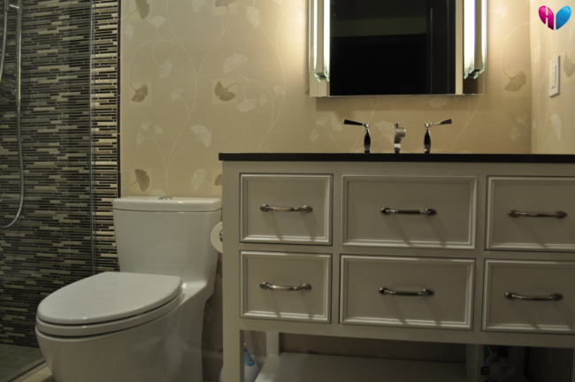 Joey Specified: Cabinet design, including layout & storage Shower size and shape, with soffit raised Glass shower enclosure Plumbing and Locations Plumbing (faucets, thermostatic shower set, body sprays, chromatherapy heated massage tub with custom therapeutic back spray nozzle, toilet, towel warmer) Electrical (Legrand backlit dimmer switches, recessed cans, wall sconces, vent fan, toe-kick light, motion…